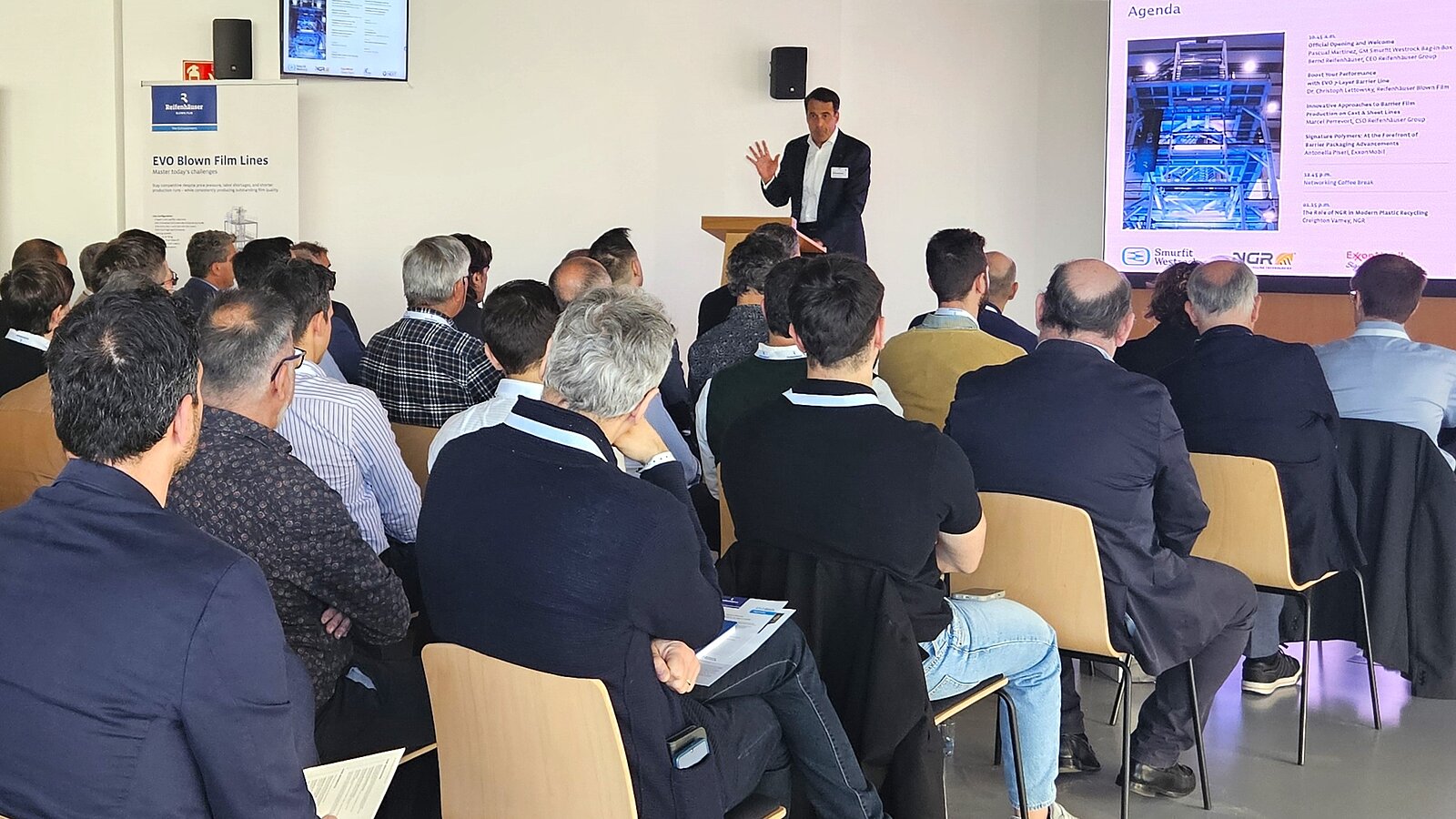 Die Live-Demonstration wurde von einer Reihe von Fachvorträgen zur Herstellung von Barrierefolien und Verpackungen begleitet. Die Vorträge 2/5 befassten sich mit den spezifischen Herausforderungen von Barriereanwendungen und zeigten die Vorteile der neuen Reifenhäuser Ultra Die Generation auf.